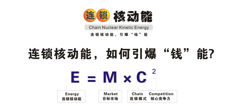 ,這是世界著名的愛因斯坦能量公式。基于愛因斯坦的相對論和能量公式,產(chǎn)生了原子彈和核電站,今天的人類太空實踐證實了愛因斯坦理論的正確性,人類因此發(fā)生了翻天覆地的變化。在愛因斯坦的能量公式中,M是質量,C是光速,當速度為光速時,即使很小的質量也能轉化為非常大的能量。 廣州采納企業(yè)管理顧問有限公司首席咨詢師陳宏創(chuàng)建的的連鎖核動能理論(全名:連鎖內(nèi)核能量裂變激增理論)是以愛因斯坦的能量公式為基礎創(chuàng)建,但其含義和指向是不同的:M=目標市場(Market),C1=連鎖模式(Chain),C2 =核心競爭力(Competition),其理論意義是,企業(yè)找準了目標市場,以連鎖的方式經(jīng)營,核心競爭力越大,推動其發(fā)展能量就越大。 連鎖核動能理論如何幫助連鎖企業(yè)“引爆錢能”快速發(fā)展?我們用深入淺出的圖形表達方式對該理論進行分層闡述: